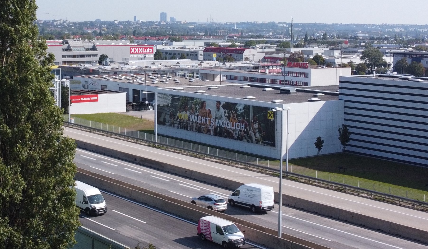 Die Werbefläche mit 1.000m² ist lange sichtbar kommend von der A23 Richtung Stadlau- Gewerbepark Stadlau – S2 Richtung Eibesbrunn G3 und Korneuburg.